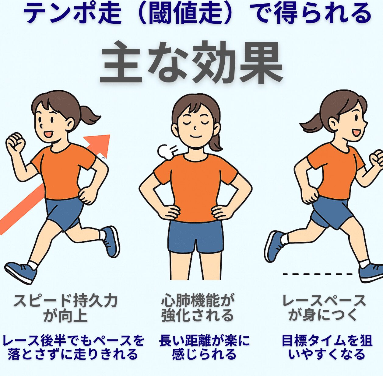 テンポ走(閾値走)を定期的に取り入れることで、ランナーにうれしい3つの大きな効果が期待できます。