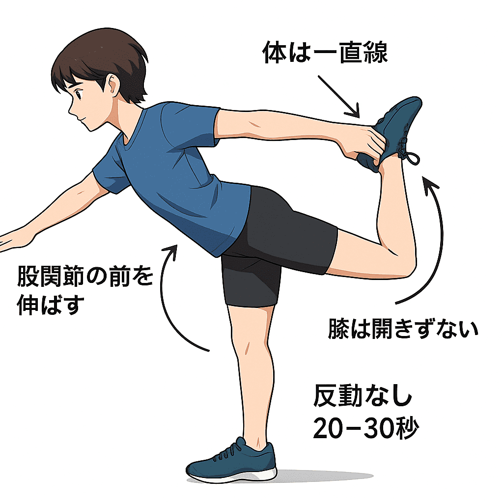 大腿四頭筋+股関節の前(腸腰筋)|左右30秒|膝は開かない/体は一直線/反動なし