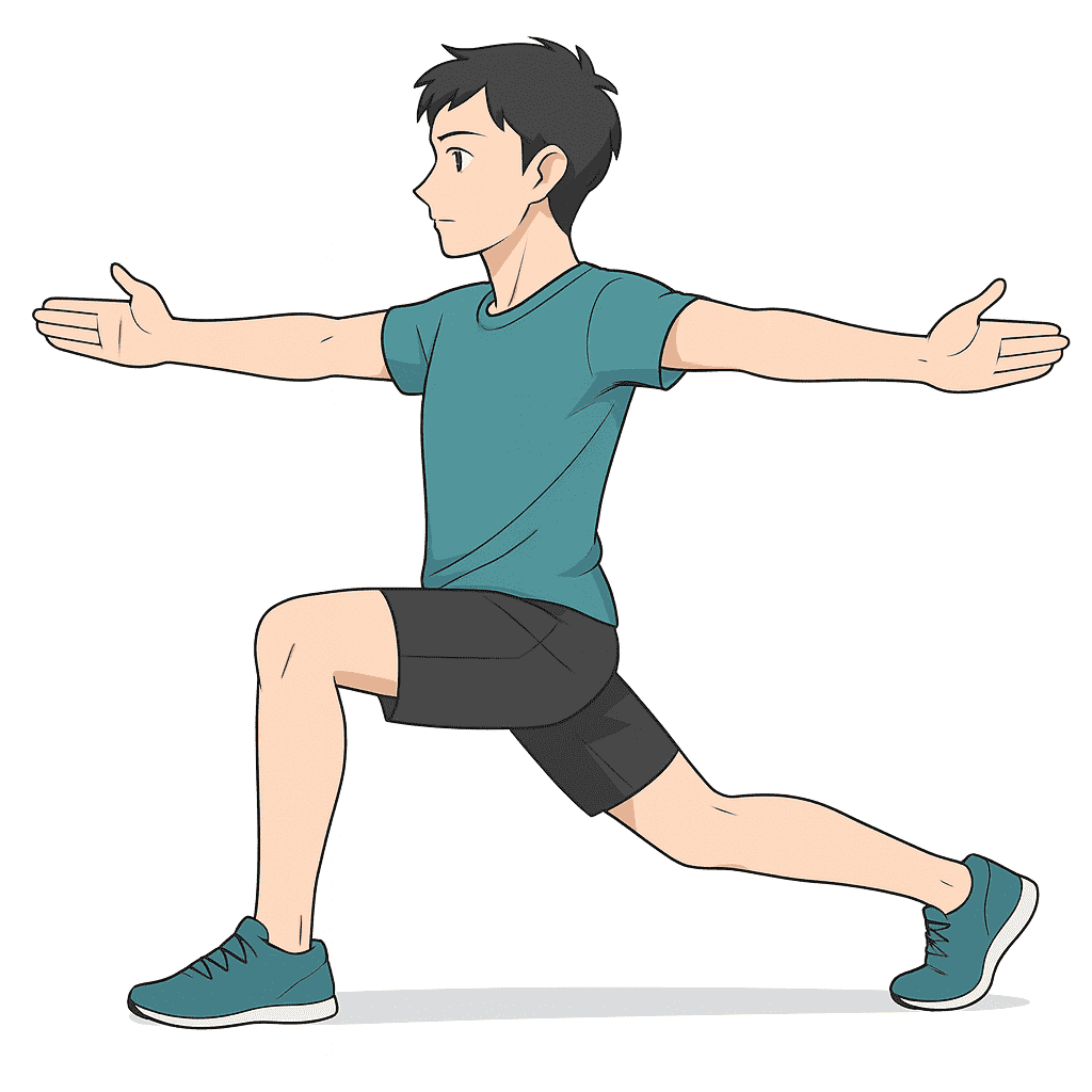 後脚のかかとを遠くへ、おへそは正面。腰をそっと前へ。両手を前後に大きく開き、胸をひらく(肩はすくめない)。