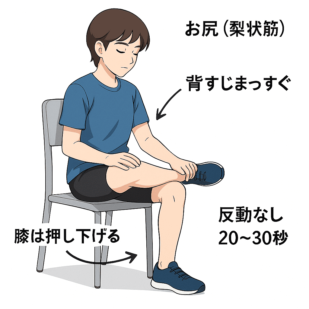 くるぶしを反対の膝に乗せ、上になっている膝を手で“下へ”そっと押す。背すじはまっすぐ、呼吸は止めない。お尻に伸び感、膝に痛みはNG